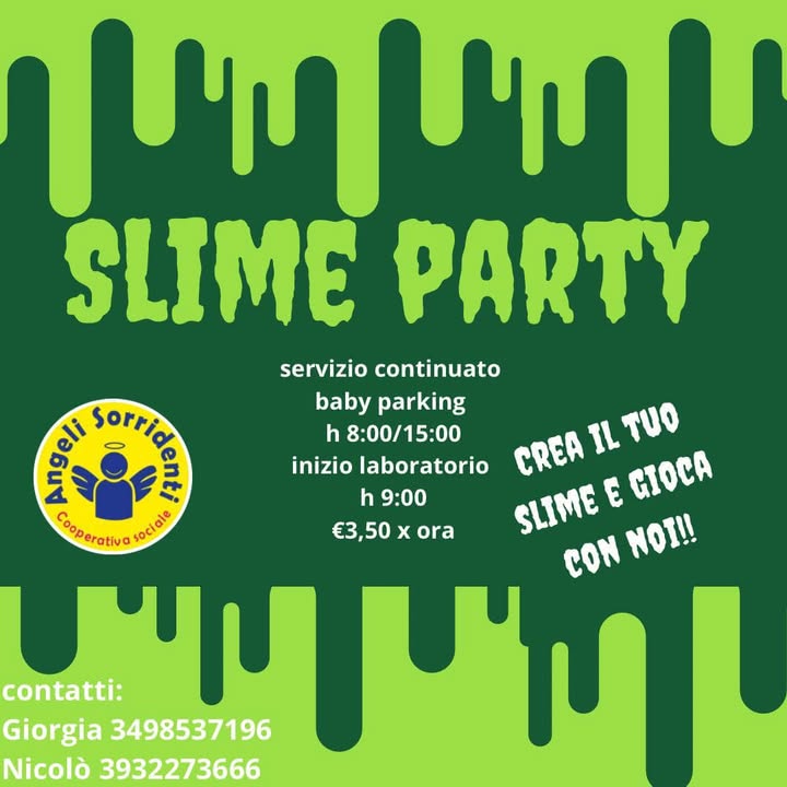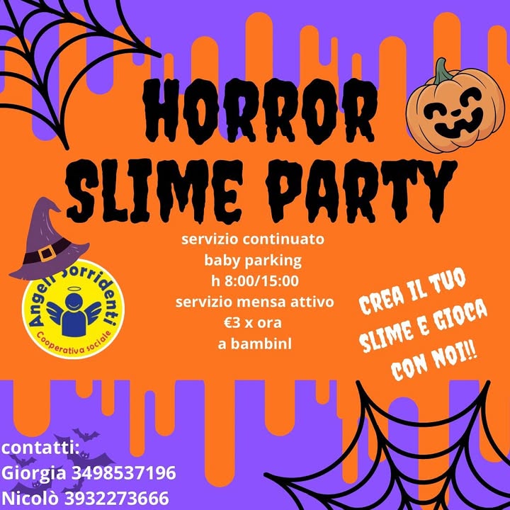 ???????? HORROR SLIME PARTY! ???????? Sta arrivando l’evento più “spaventoso” e divertente dell’anno! Un’intera giornata di giochi, colori e slime mostruosi ti aspetta alla sede di Angeli Sorridenti ???? ???? Dalle 8:00 alle 15:00 ???? Solo 3€ l’ora a bambino ???? Servizio mensa attivo ???? Baby parking e attività creative no-stop! ???? Crea il tuo …