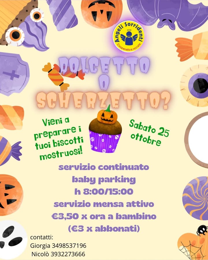 ???? DOLCETTO O SCHERZETTO? ???? Sabato 25 ottobre vieni a preparare insieme a noi i tuoi biscotti mostruosi! ???????? Un laboratorio creativo pieno di risate, zucchero e tanta fantasia — perfetto per entrare nell’atmosfera di Halloween in modo dolce e divertente! ???? ???? Servizio continuato di baby parking ???? Dalle 8:00 alle 15:00 ???? Servizio …